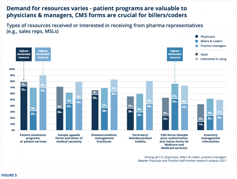 Regarding practices’ preferences for interacting with life sciences specialists; the research revealed that physicians, practice managers, and billers and coders are interested in different types of resources for their practice and patients. In Figure 5, you will see that the demand for life sciences resources varies among audiences.